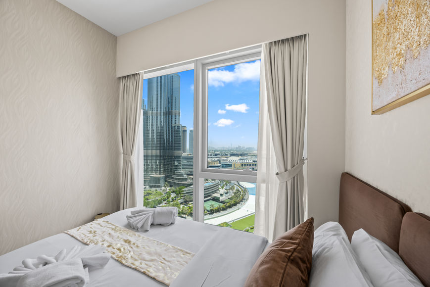 The property has unobstructed views of Burj and Dubai Waterfountain with Dubai Mall from all the rooms which includes living and two bedrooms. The property has two bedroom one with a king size bed and one with two queen size beds so it accommodates 6 paxs. It has a full functioning kitchen and 2 bathrooms. It also has a balcony attached to living room to enjoy the spectacular views of the Burj & Dubai Water fountain.