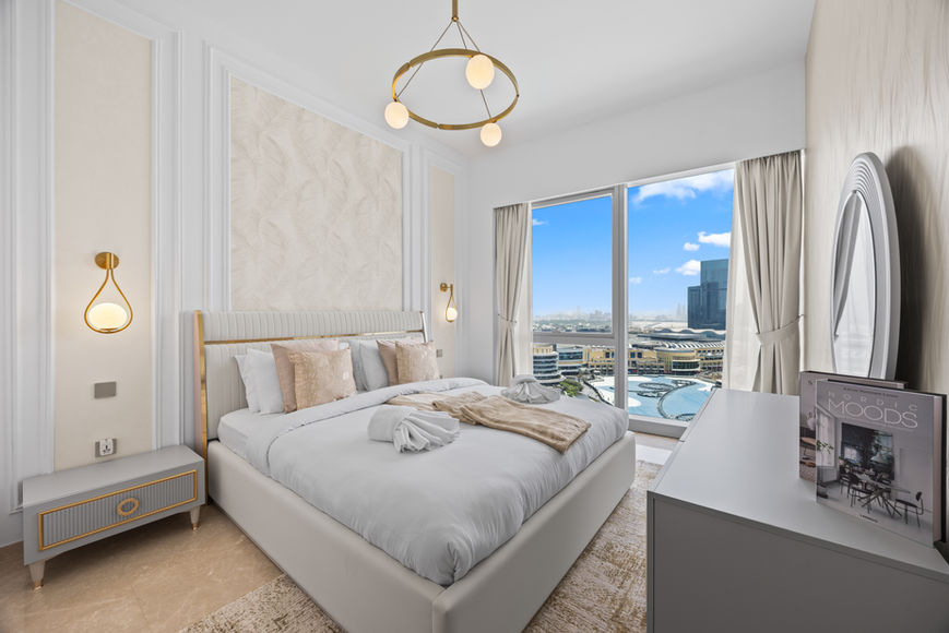 Experience the ultimate Dubai getaway in our luxuriously designed apartment with breathtaking views of iconic Burj Khalifa and the world famous Dubai fountain show, all from the comfort of your home. Both bed rooms and living room with Balcony, has this astonishing view. This stunning apartment comes with a fully equipped kitchen, Gym and Burj view Infinity pool.It is also a 7 minutes walk from Dubai Mall and just adjacent to Dubai Opera.